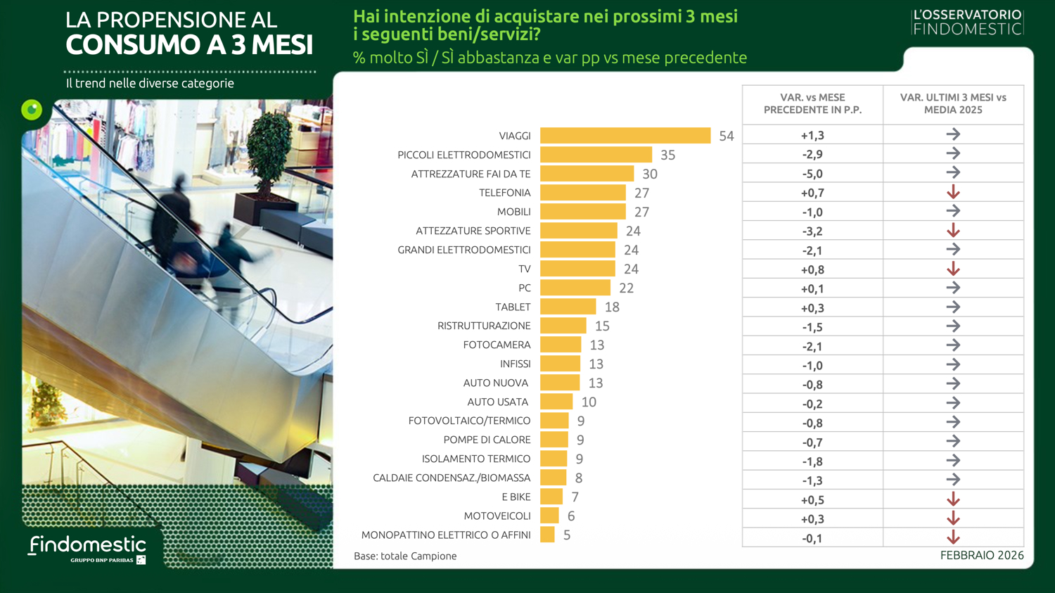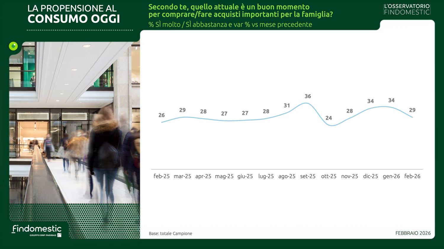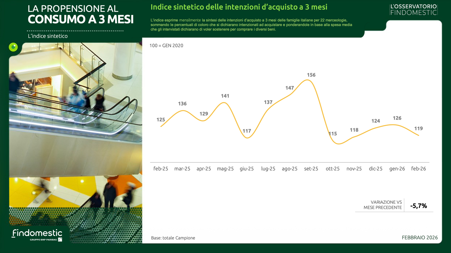 Le intenzioni d’acquisto degli italiani tornano a diminuire: a febbraio l’indice monitorato dall’Osservatorio mensile Findomestic segna un calo del 5,7%, riportandosi sui livelli autunnali dopo la breve ripresa di fine anno. Un arretramento che si inserisce in un contesto nel quale quasi quattro famiglie su dieci continuano a ritenere la propria situazione economica “abbastanza o molto problematica”.