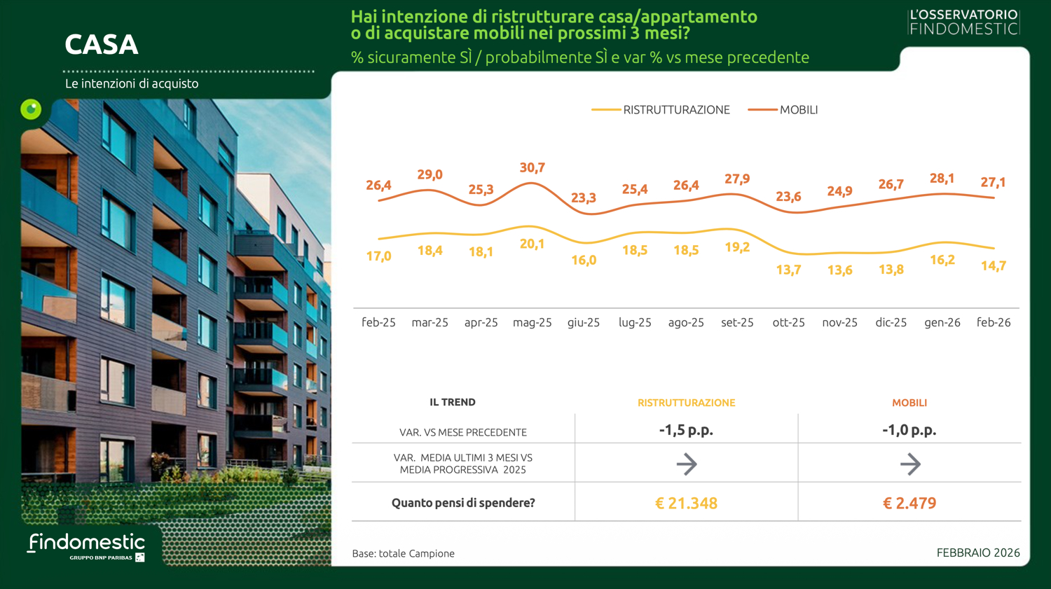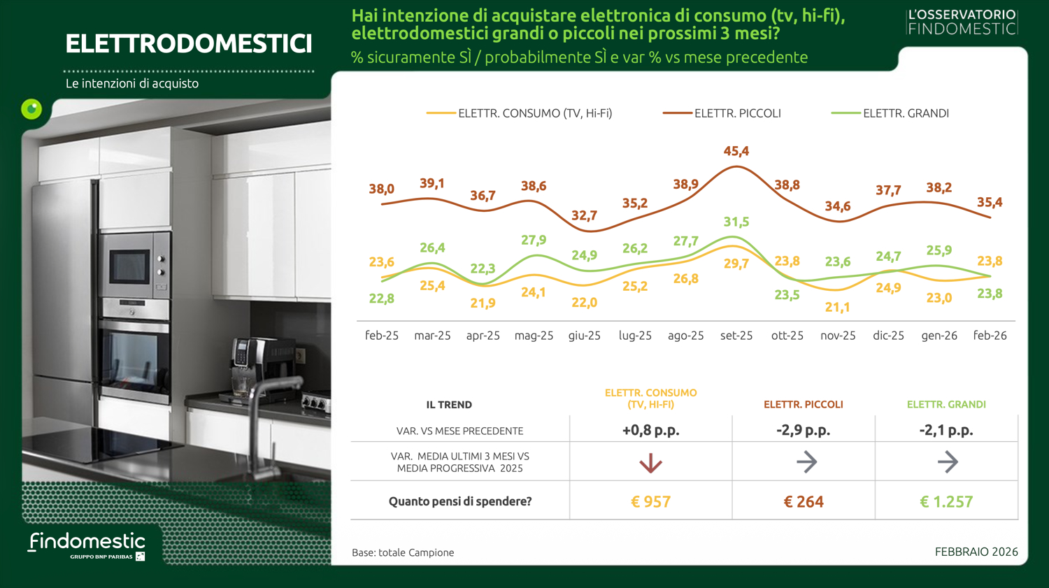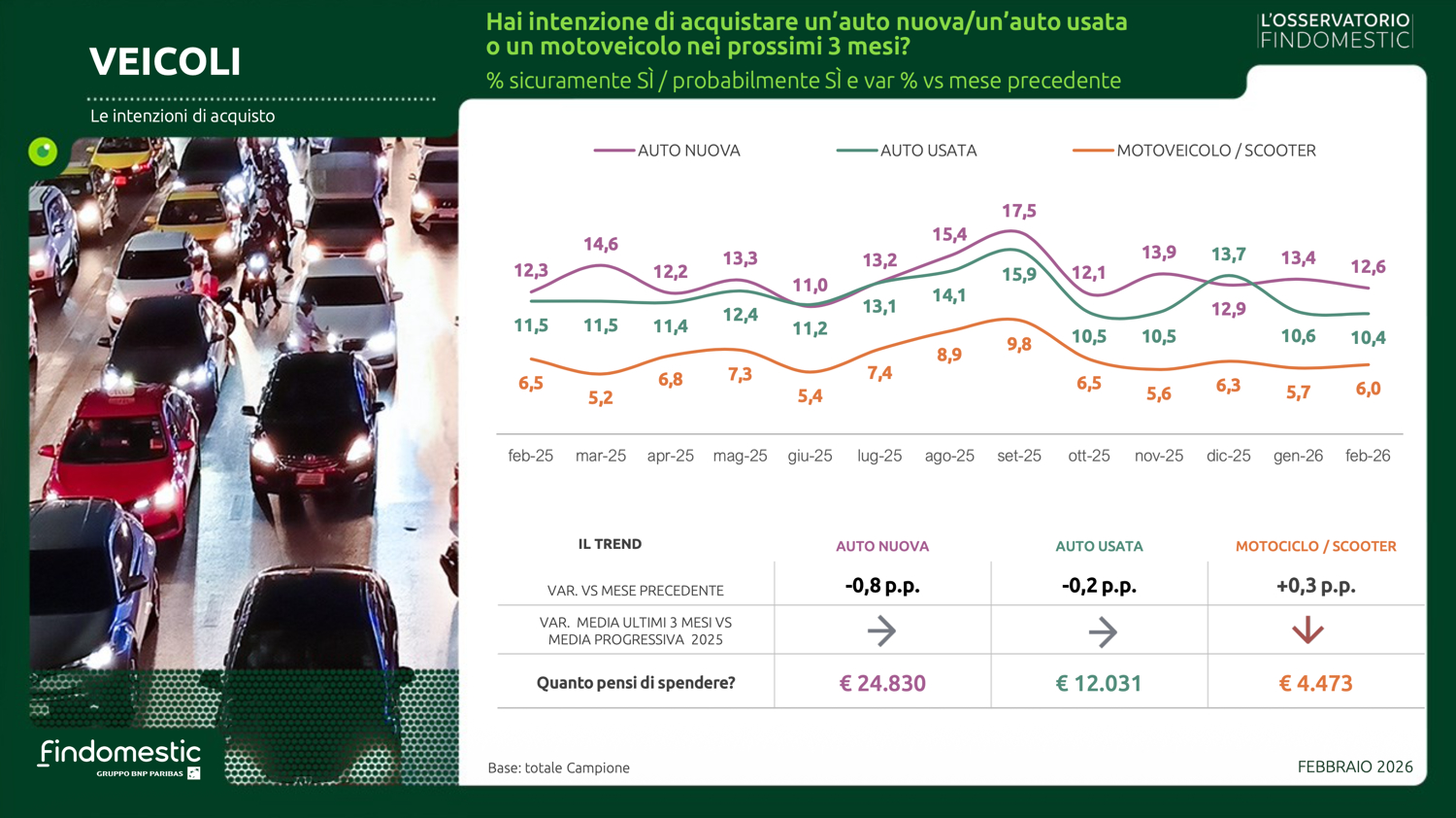 Le intenzioni d’acquisto degli italiani tornano a diminuire: a febbraio l’indice monitorato dall’Osservatorio mensile Findomestic segna un calo del 5,7%, riportandosi sui livelli autunnali dopo la breve ripresa di fine anno. Un arretramento che si inserisce in un contesto nel quale quasi quattro famiglie su dieci continuano a ritenere la propria situazione economica “abbastanza o molto problematica”.