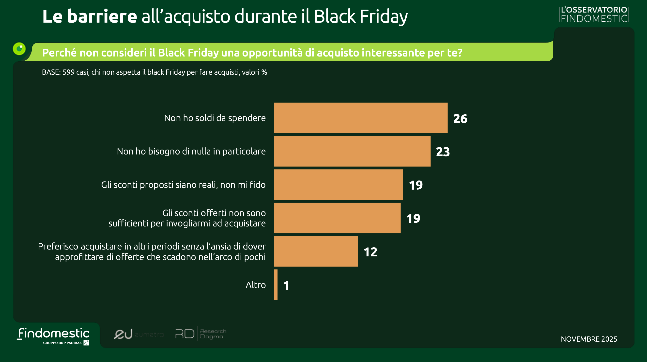 In 6 su 10 non aspettano il Black Friday. L’analisi dell’Osservatorio Findomestic evidenzia che il 26% di chi non lo considera un’opportunità per acquistare dichiara di non avere risorse economiche sufficienti e il 23% afferma semplicemente di non aver bisogno di nulla. A frenare ulteriormente l’entusiasmo contribuisce la diffidenza verso le promozioni: il 19% non si fida degli sconti praticati e un altro 19% li considera troppo modesti.