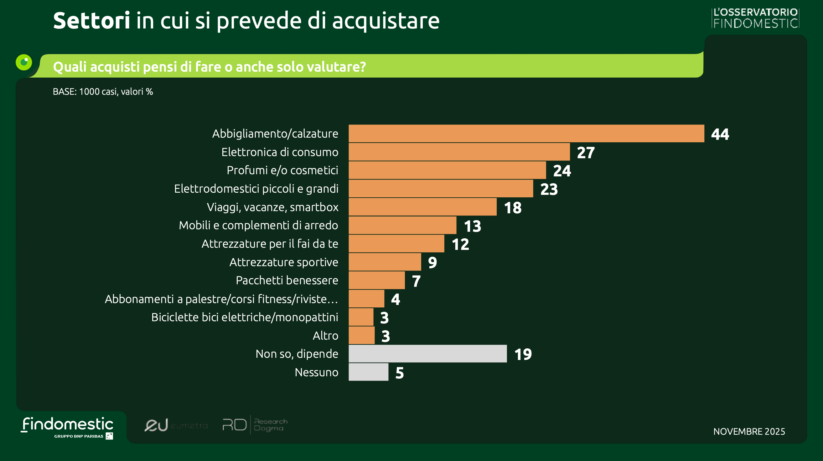 Il Black Friday ormai non è solo una occasione per l’acquisto di tecnologia. In cima alle preferenze si consolidano abbigliamento e calzature (44%), seguiti da tecnologia (27%), profumi e cosmetici (24%) ed elettrodomestici (23%).