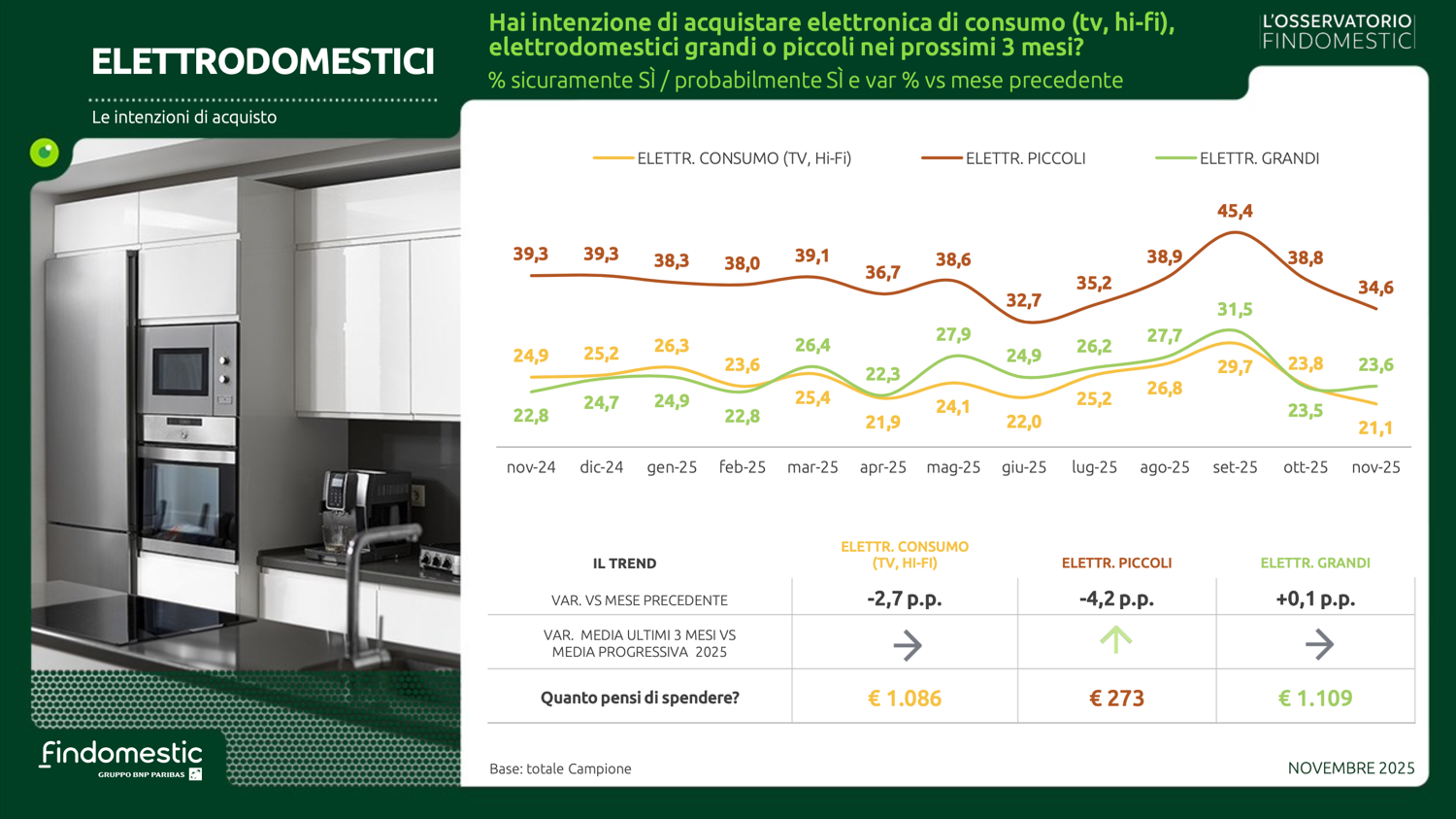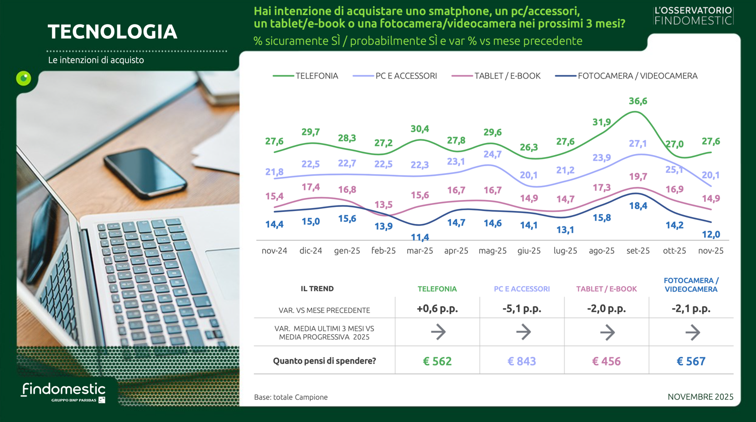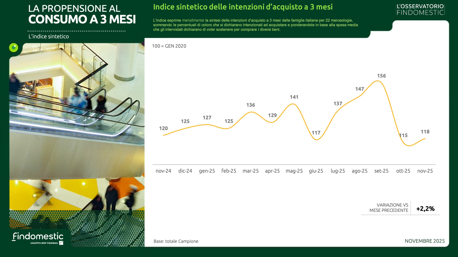 Con le preoccupazioni mediamente in lieve calo e un clima di fiducia verso il futuro in leggero miglioramento, anche le intenzioni d’acquisto a novembre evidenziano una modesta crescita. A riportare in positivo l’indice sintetico (che fa una media ponderata delle rilevazioni effettuate in 22 categorie merceologiche) sono le buone performance di mercati importanti come il mobile, l’auto, la telefonia e l’isolamento termico.