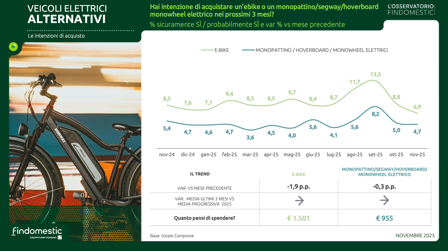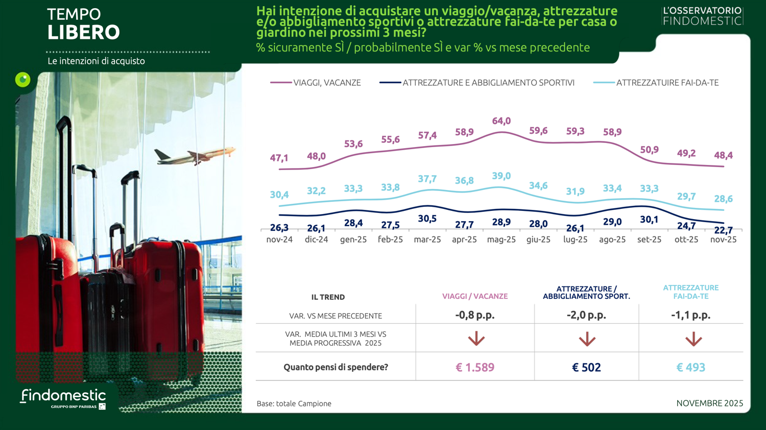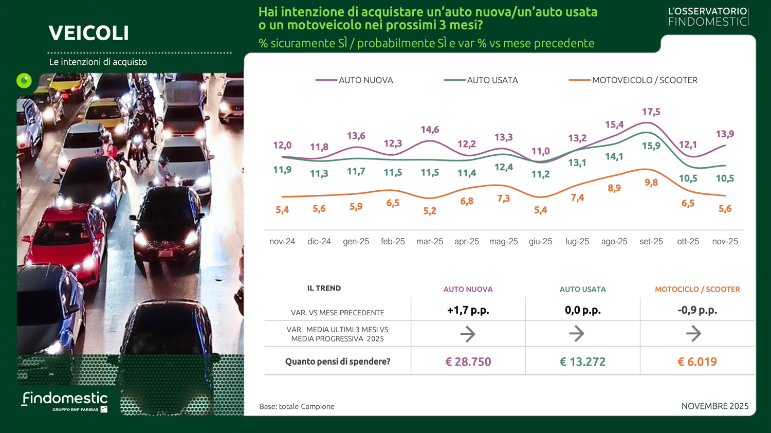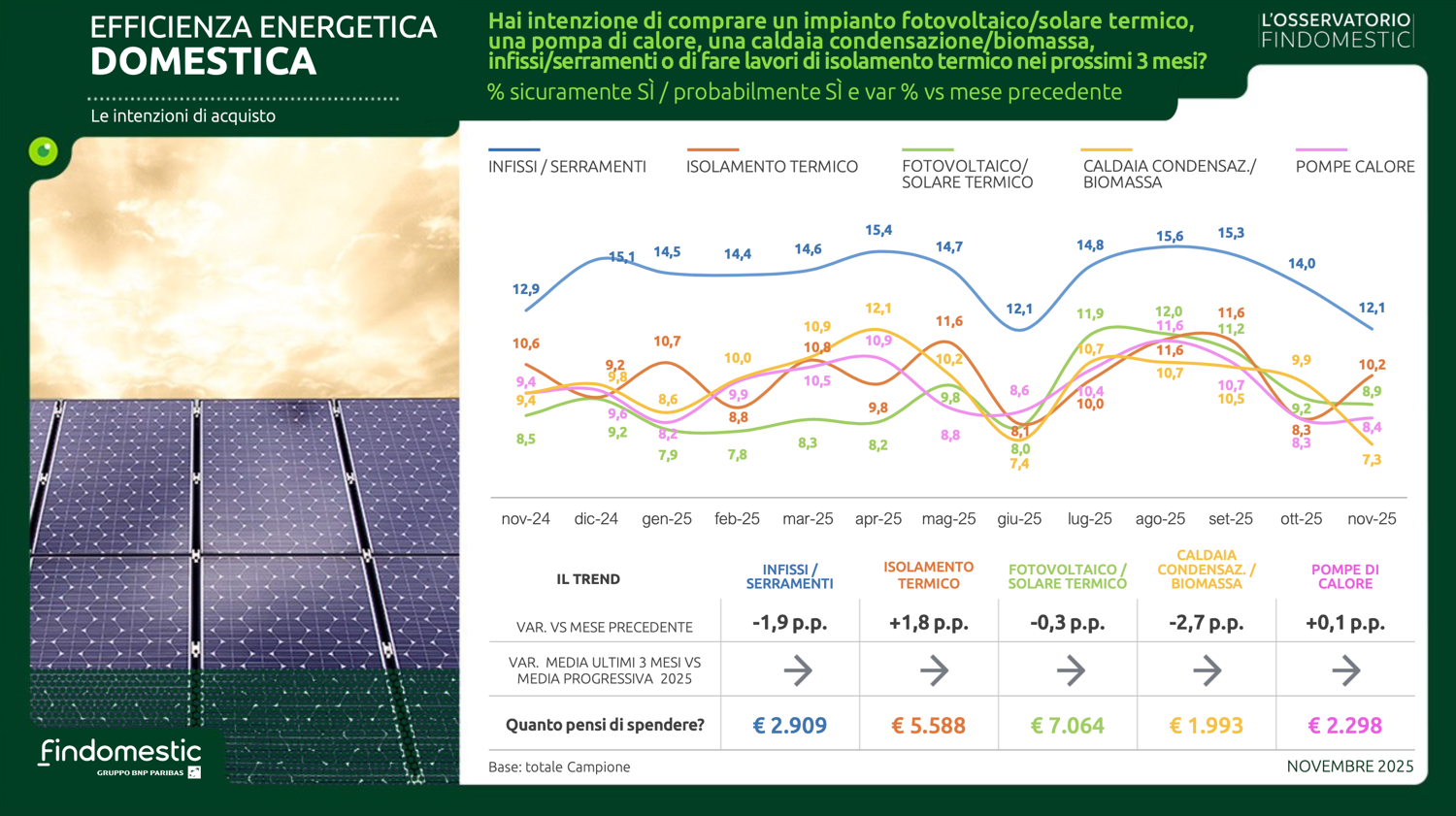 Con le preoccupazioni mediamente in lieve calo e un clima di fiducia verso il futuro in leggero miglioramento, anche le intenzioni d’acquisto a novembre evidenziano una modesta crescita. A riportare in positivo l’indice sintetico (che fa una media ponderata delle rilevazioni effettuate in 22 categorie merceologiche) sono le buone performance di mercati importanti come il mobile, l’auto, la telefonia e l’isolamento termico.