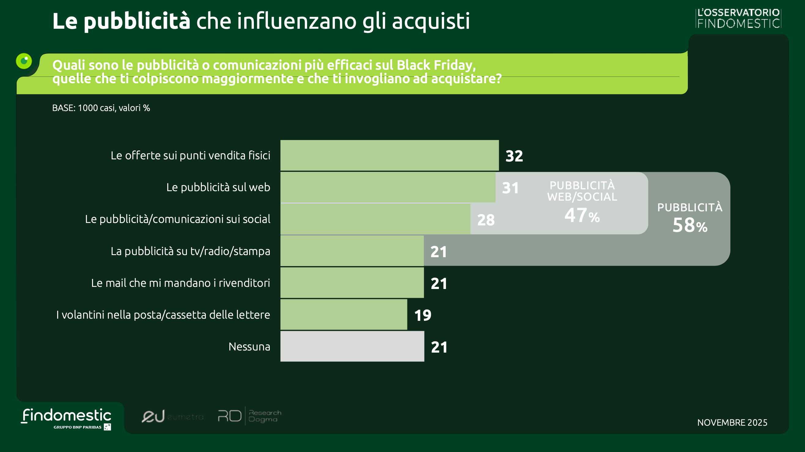 In 6 su 10 non aspettano il Black Friday. L’analisi dell’Osservatorio Findomestic evidenzia che il 26% di chi non lo considera un’opportunità per acquistare dichiara di non avere risorse economiche sufficienti e il 23% afferma semplicemente di non aver bisogno di nulla. A frenare ulteriormente l’entusiasmo contribuisce la diffidenza verso le promozioni: il 19% non si fida degli sconti praticati e un altro 19% li considera troppo modesti.